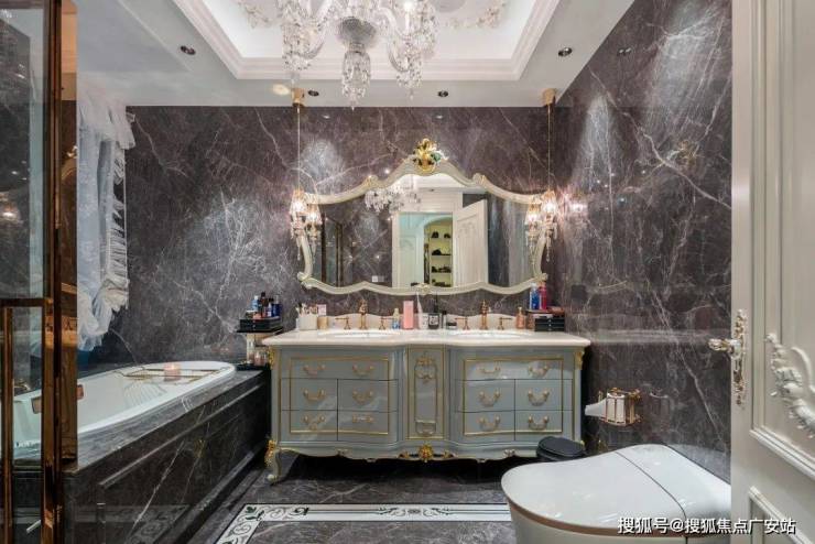 即便是私密的卫浴间,挚友也未曾忽略对美的追求。简一阿波罗灰墙地通铺,与质感水晶灯、法式风洗漱台相得益彰,展现出低调而高级的自然美感。