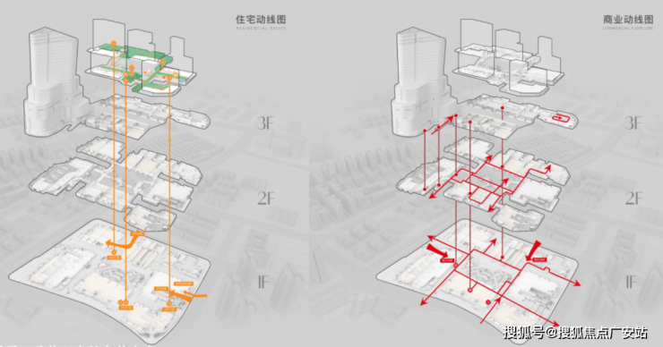 这时候有人势必要问,楼下商业,会不会太嘈杂?那就看看万科为产品设计的动线透视:在住宅和商业裙楼之间嵌入了一个“过渡空间”,打造了住宅动线和商业动线是永不相交的模式。