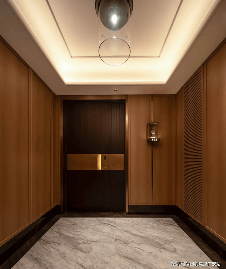 走出电梯间后,入户门旁还设计了玻璃壁龛,仪式感拉满。