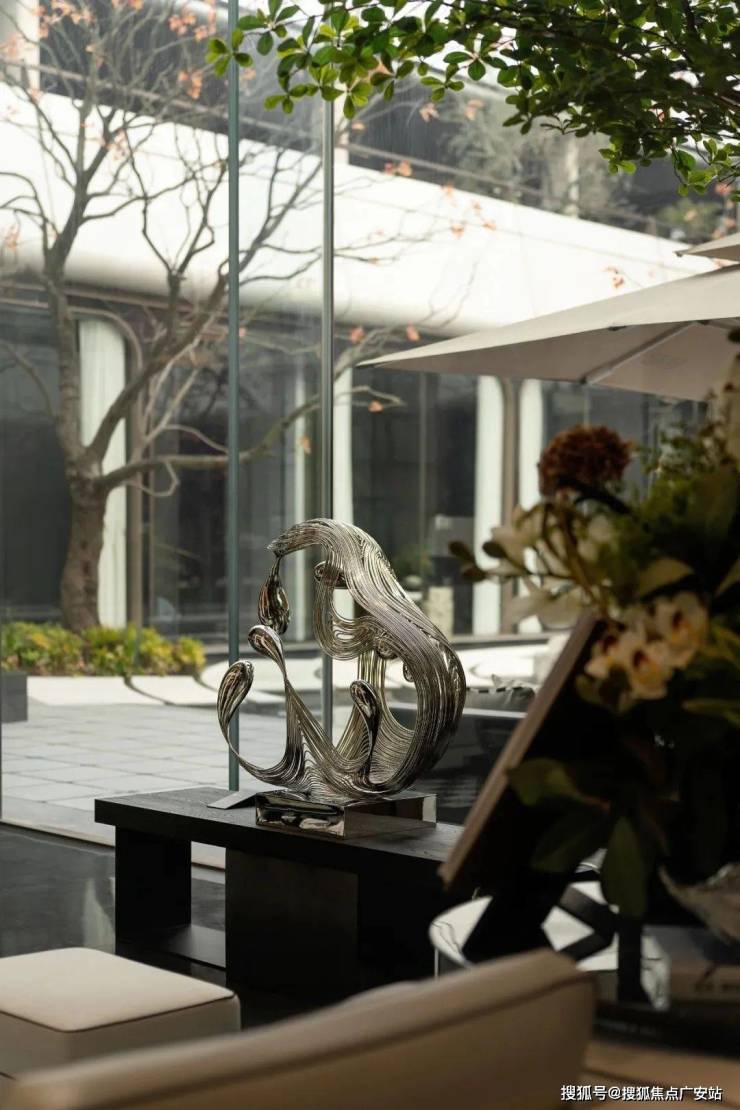 并通过跌水、涌泉和镜面水景等水景组合,将内部水景与外部水岸紧密相连。