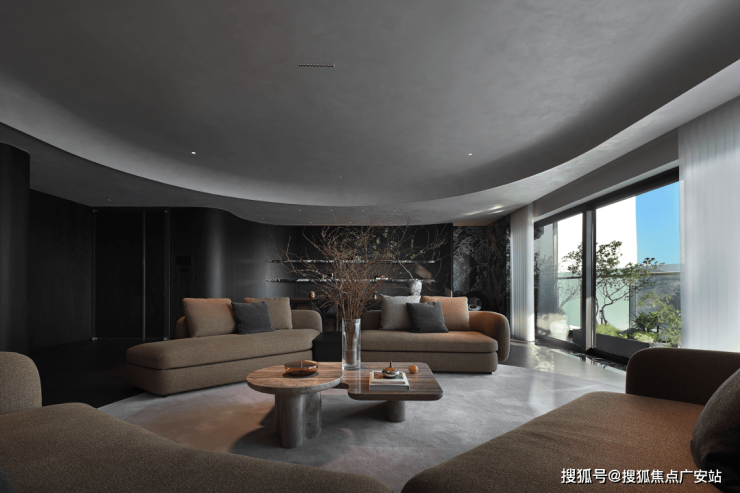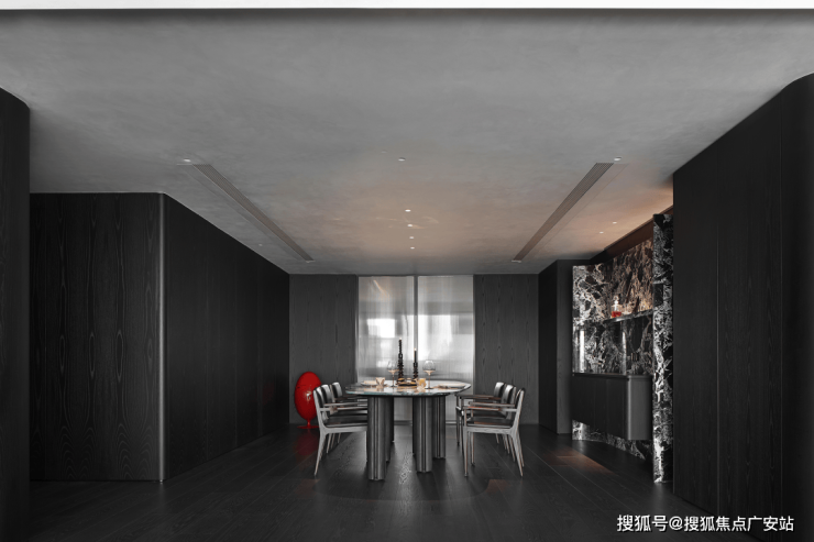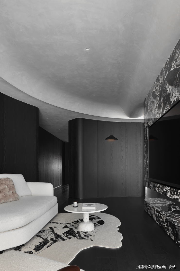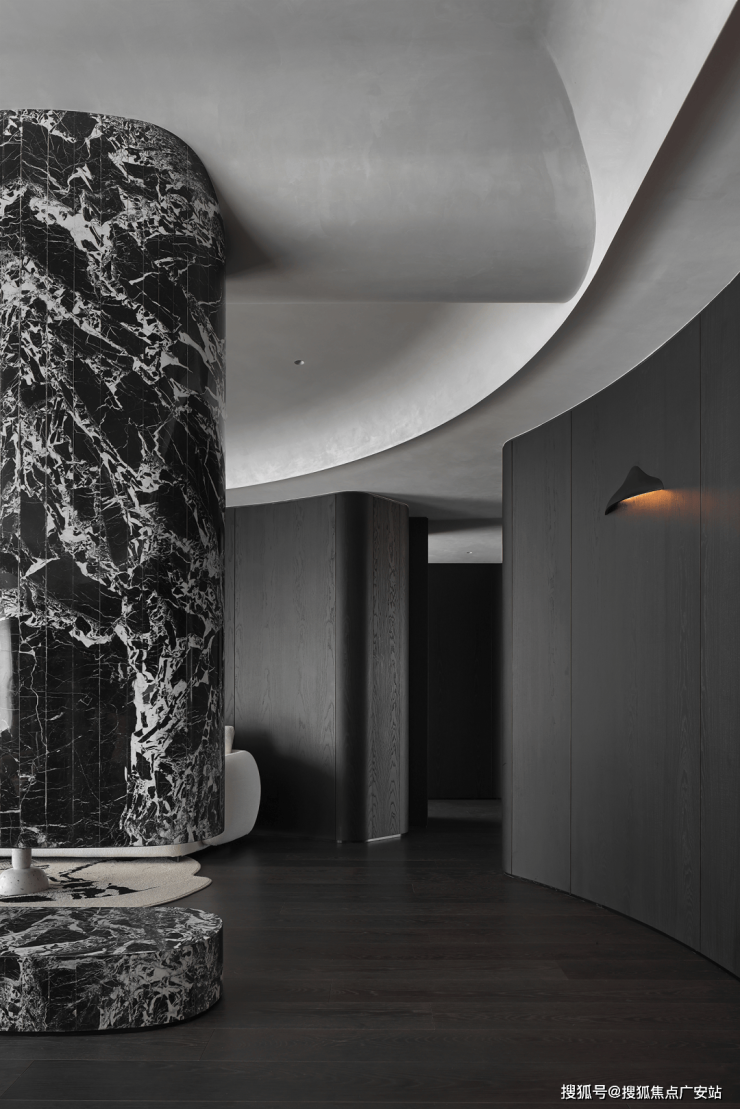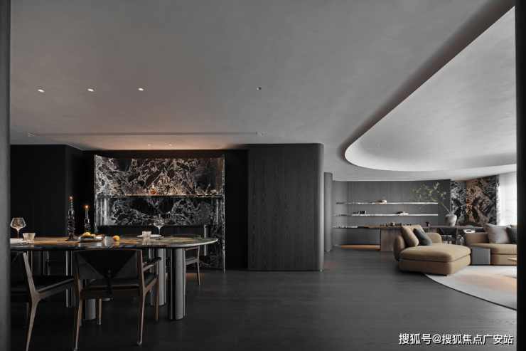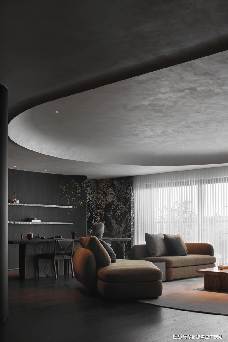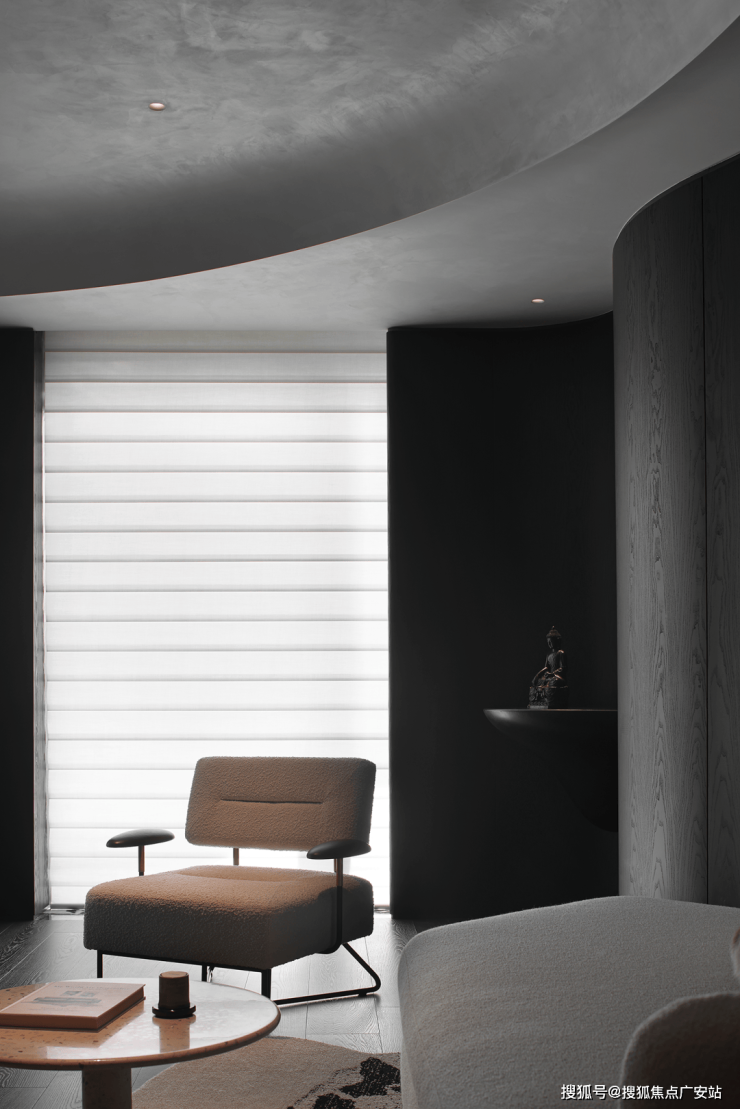 业主的想法与执著设计的理念不谋而合,满足功能性需求后,以“隐于形的诗意”为核心,通过精心策划,打破了线性空间的固有逻辑,于蜿蜒的曲线形态与深色空间画布中,缔造出明朗大气、优雅静谧的氛围感。