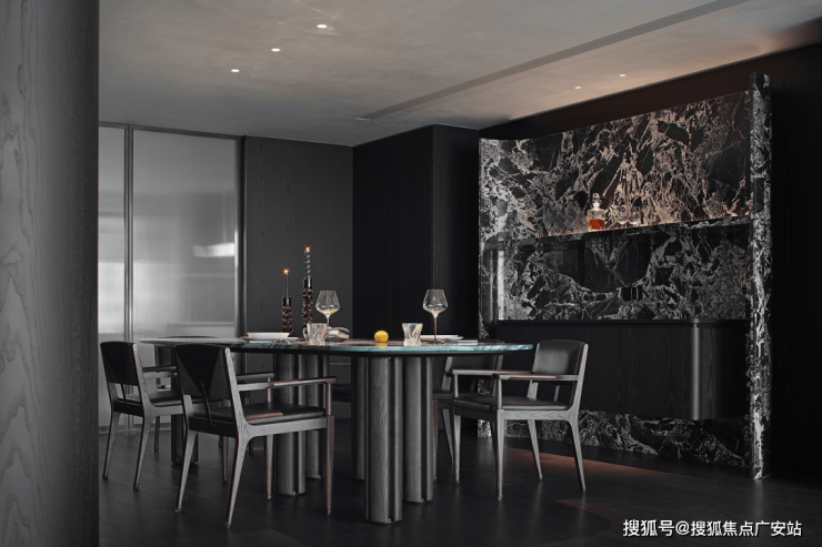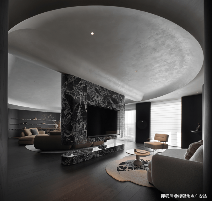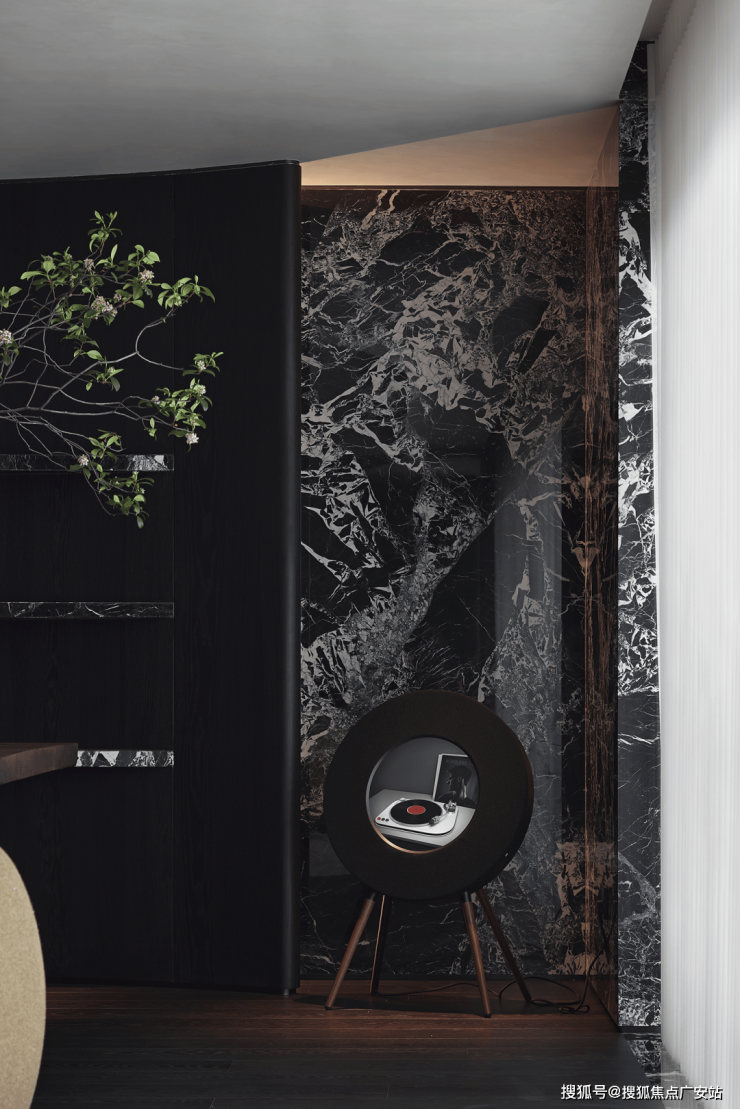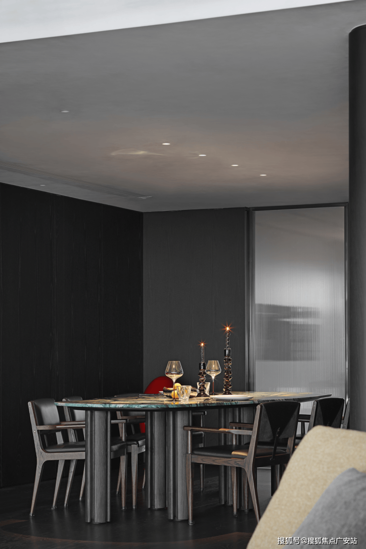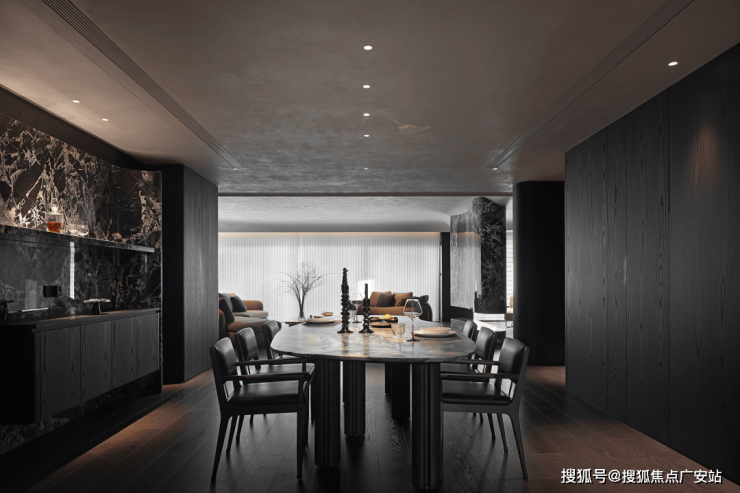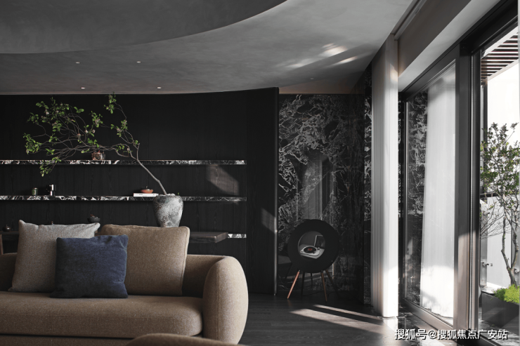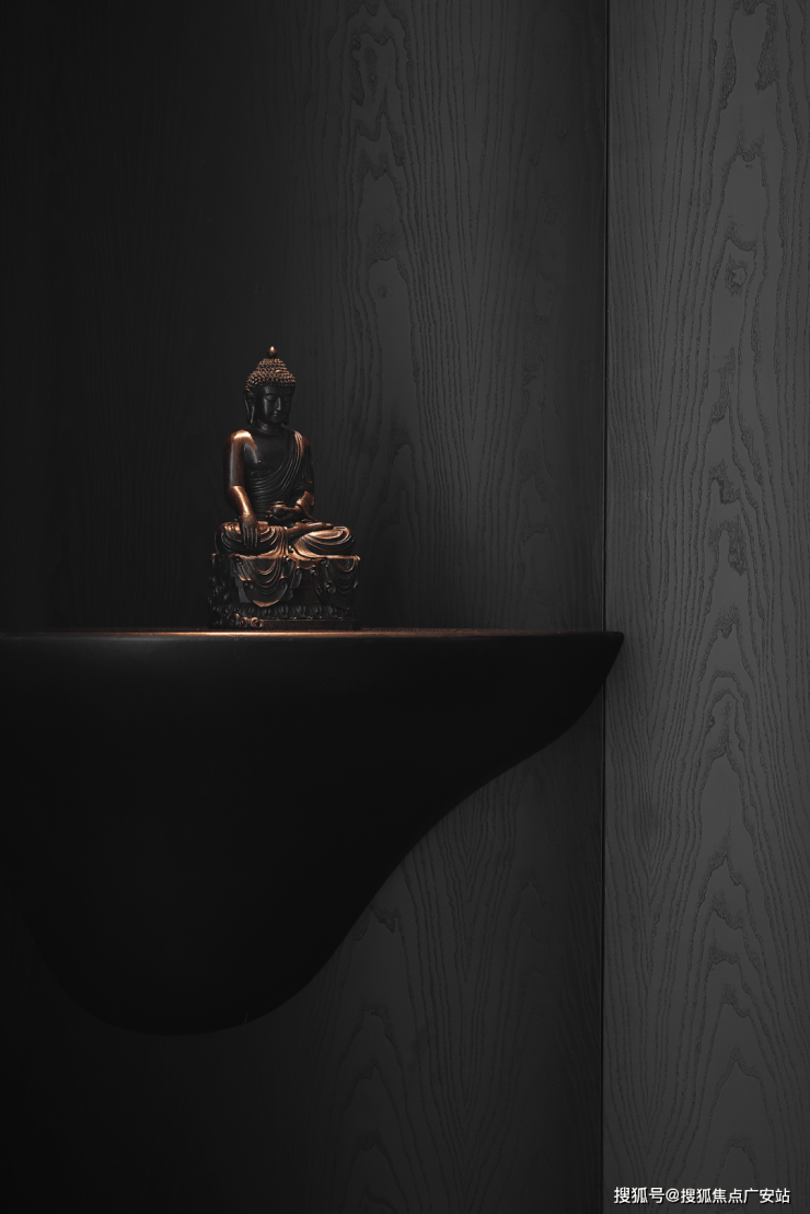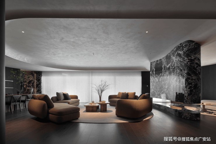 业主的想法与执著设计的理念不谋而合,满足功能性需求后,以“隐于形的诗意”为核心,通过精心策划,打破了线性空间的固有逻辑,于蜿蜒的曲线形态与深色空间画布中,缔造出明朗大气、优雅静谧的氛围感。