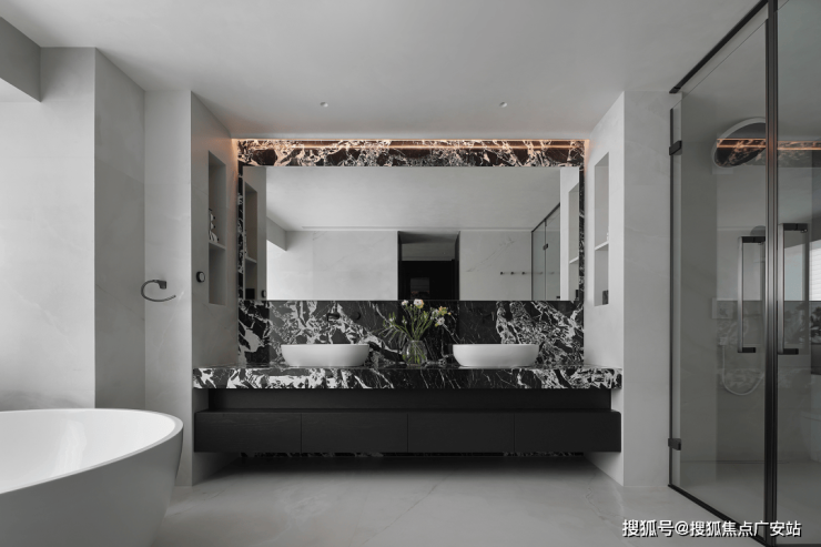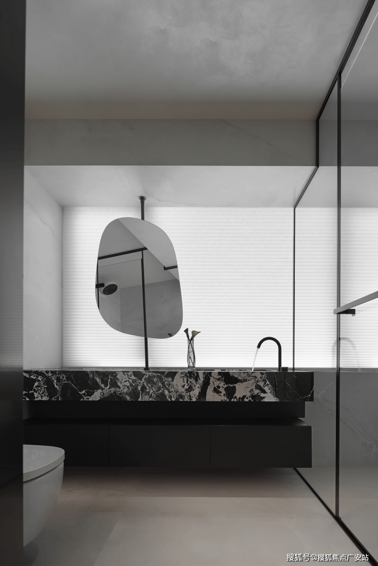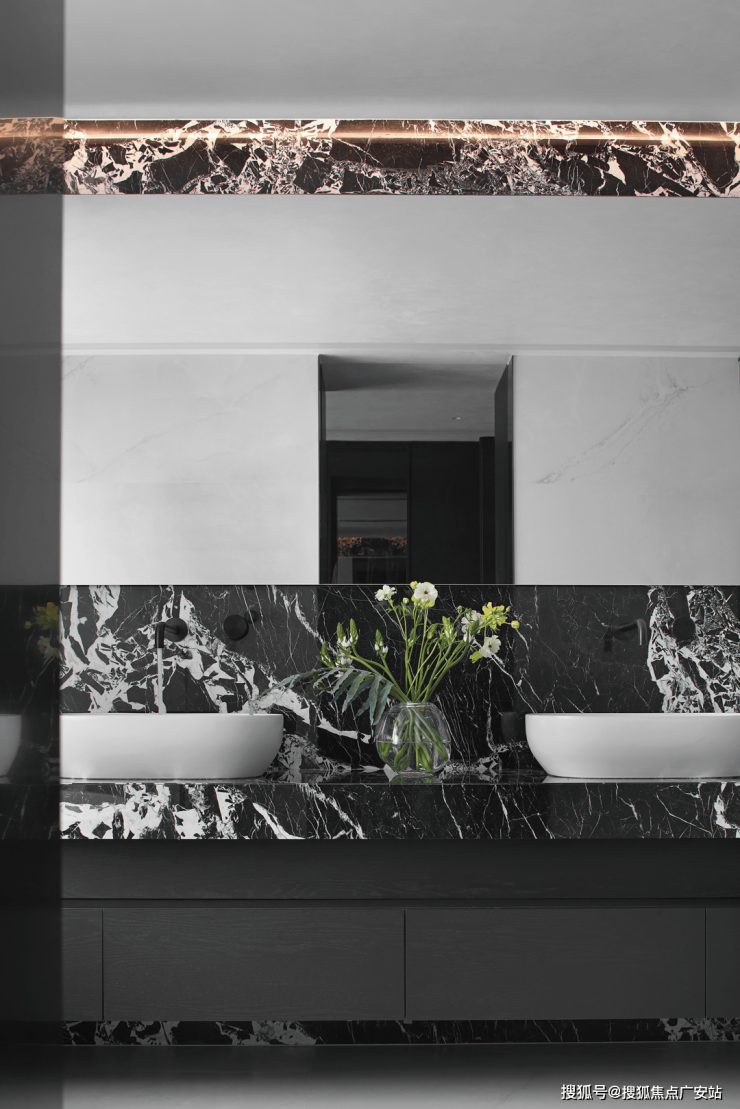 卫浴空间的设计,更凸显出材质及细节处理的重要性。在镜面与柔和的灯光下,既有效扩充空间,于细微处提升体验感。