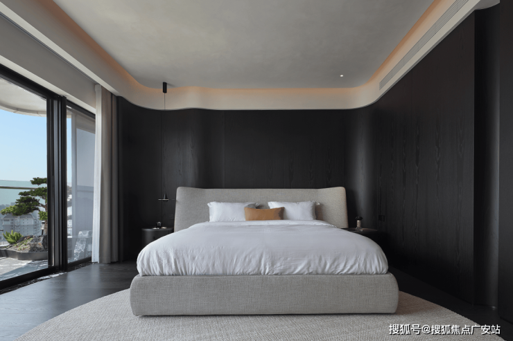 进入主卧,落地窗模糊了房内外的界限,露台上的绿植、景观成为休息时最好的背景,随时都能与自然风光亲密接触。