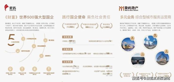 象屿地产集团成立于1993年,是厦门市属国有企业、《财富》世界500强象屿集团的全资子公司。公司聚焦地产开发、商业运营、物业服务、工程代建四大业务领域,以住宅开发为核心,涵盖商业、旧改、长租、养老等丰富业态。秉持“构筑幸福人生“的品牌理念”,致力于打造受人尊敬的综合型城市服务运营商。公司连续多年获评“中国房地产百强企业”、“中国房地产开发稳健经营10强”、“中国华东房地产品牌价值TOP10”。