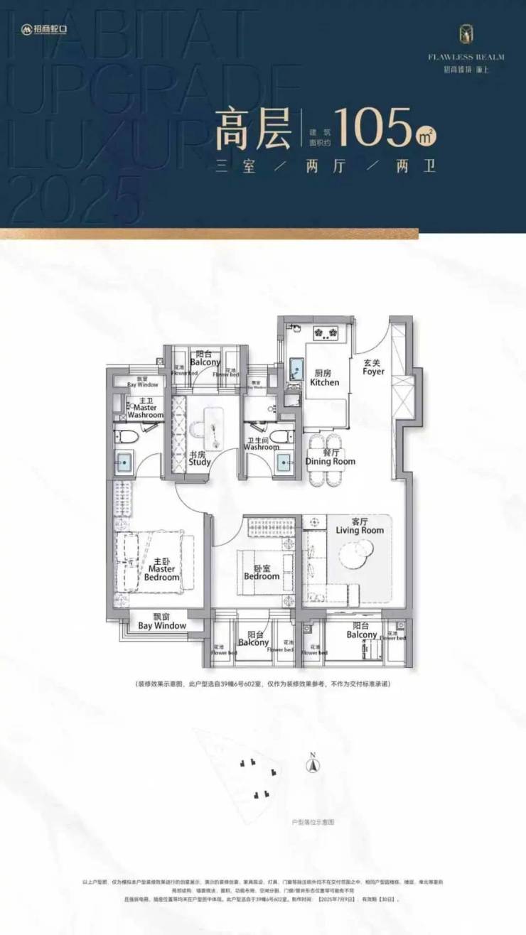建筑面积约105㎡三房,进阶改善绝版“三阳台”户型,主力总价段约700万级,部分房源总价约650万级。