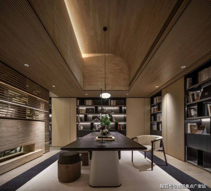 书架以及空间中预先设定的轮廓线条,精准地勾勒出隔而不断的空间形态。书架仿佛具有神奇的魔力,打破了空间的界限,将会客区、餐厅、书房与文化韵味巧妙融合,每个区域既相互关联,又有着各自独特的层次,形成了一种和谐而又富有变化的空间秩序。