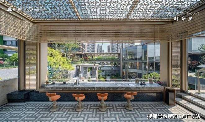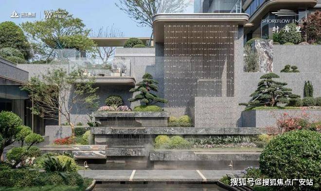 其中下沉水院作为关键归家场景之一,以水为引,叠瀑飞流,对景廊架,还有风景连廊,搭配波光粼粼的镜面水景和绿植点缀。