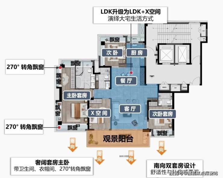 部分户型主卧套房、北向次卧采用270°环幕式转角飘窗设计,双面采光扩大了室内的采光视野;部分户型北次卧还是罕见双飘窗设计,大大增加使用率和室内采光。