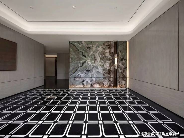 还有首层轿厢内电梯门也特别做了定制细节处理,使用金属蚀刻工艺不锈钢电梯门,高定专属纹案,近看能摸到细腻的凹凸质感;电梯厅内采用维多利亚绿奢石和温德姆灰石材打造,匹配类独厅设计的归家尊仪……奢石大量运用于公区,与超级豪宅相比都毫不逊色。