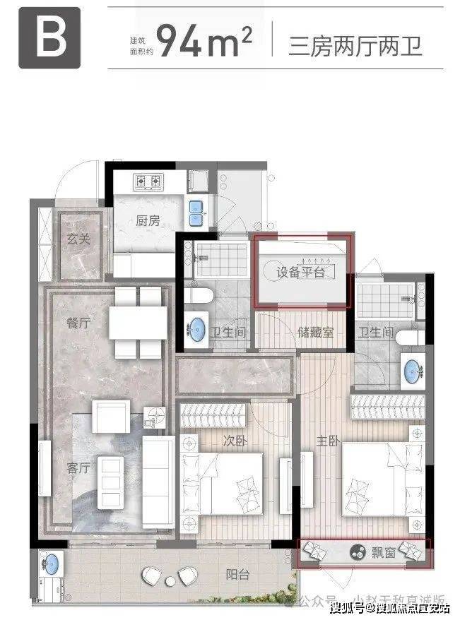 建面约94㎡三房两厅两卫: