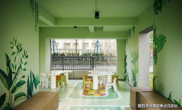 架空层儿童区坐凳采用不锈钢转木纹工艺,将自然纹理与金属材质融合,赋予了木纹的温暖与质感,来提升空间整体的视觉质量。融入一片生机勃勃的空间中,墙面郁郁葱葱的绿植与精心布置的座椅相辉映,引领着孩子们进入一个充满欢笑与探索的世界。