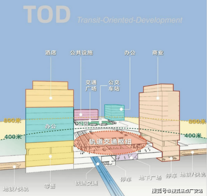 TOD把公交和土地资源利用紧密结合:用公共交通为导向的综合用地组团为节点的布局方式——公共交通站点为中心在其周围设置多种物业形态形成核心;以此高效利用城市土地,使城市健康发展。