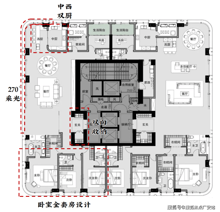针对高净值客户,私密性显然是最重要的。电梯双开门设计,家政服务人员也有单独出入动线,尽可能减少对业主的影响。