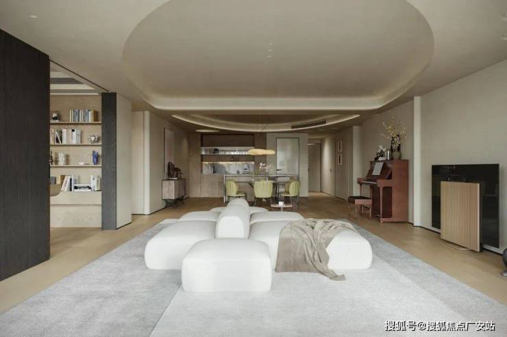 为营造自由通透的空间感,我们规划流畅生活动线。米灰色低饱和模块沙发,以多面体块拼接造型,灵活适配不同视角与布局,成为家庭核心区焦点。它与多功能房、餐厅、水吧等区域形成视觉呼应,构建出 “平行陪伴” 的温馨生活场景。