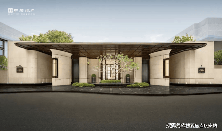 项目的主入口,门头承袭玖字理念,约55m横向尺度与约7m纵向高度,高于传统的约4m高景墙,搭配通高陈列的全石材柱体,恭迎业主归家。