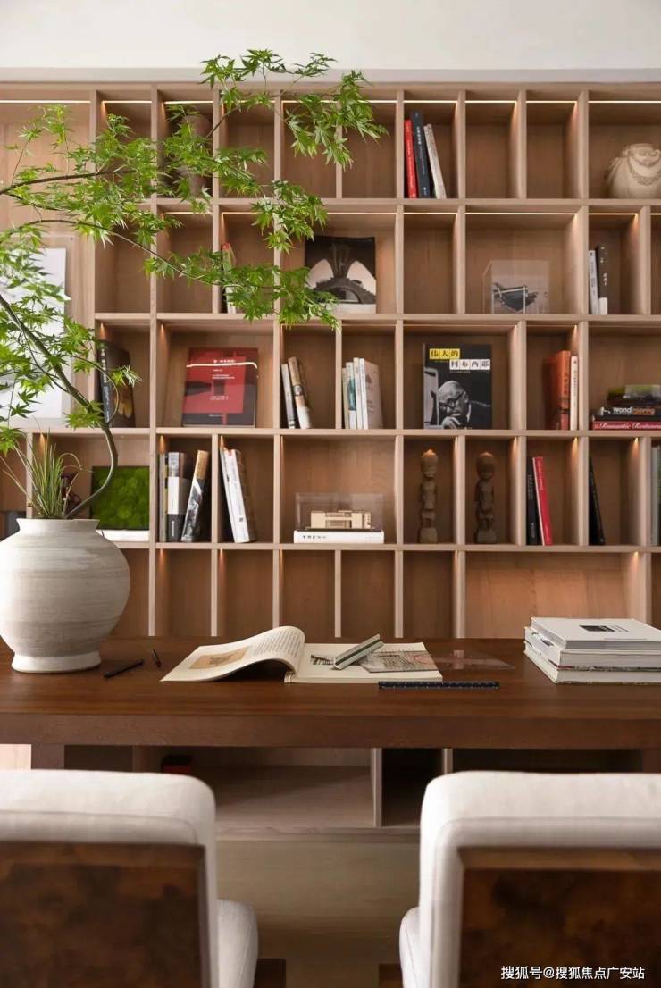 书房被藏在墙面的木色隐形门内,隐形门巧妙地在客厅与书房之间作了缓冲,避免白色“重叠”而造成疲劳感。