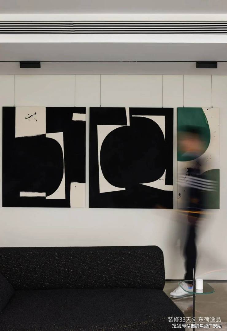 ▲ 过道墙面用轨道吊起黑白艺术挂画