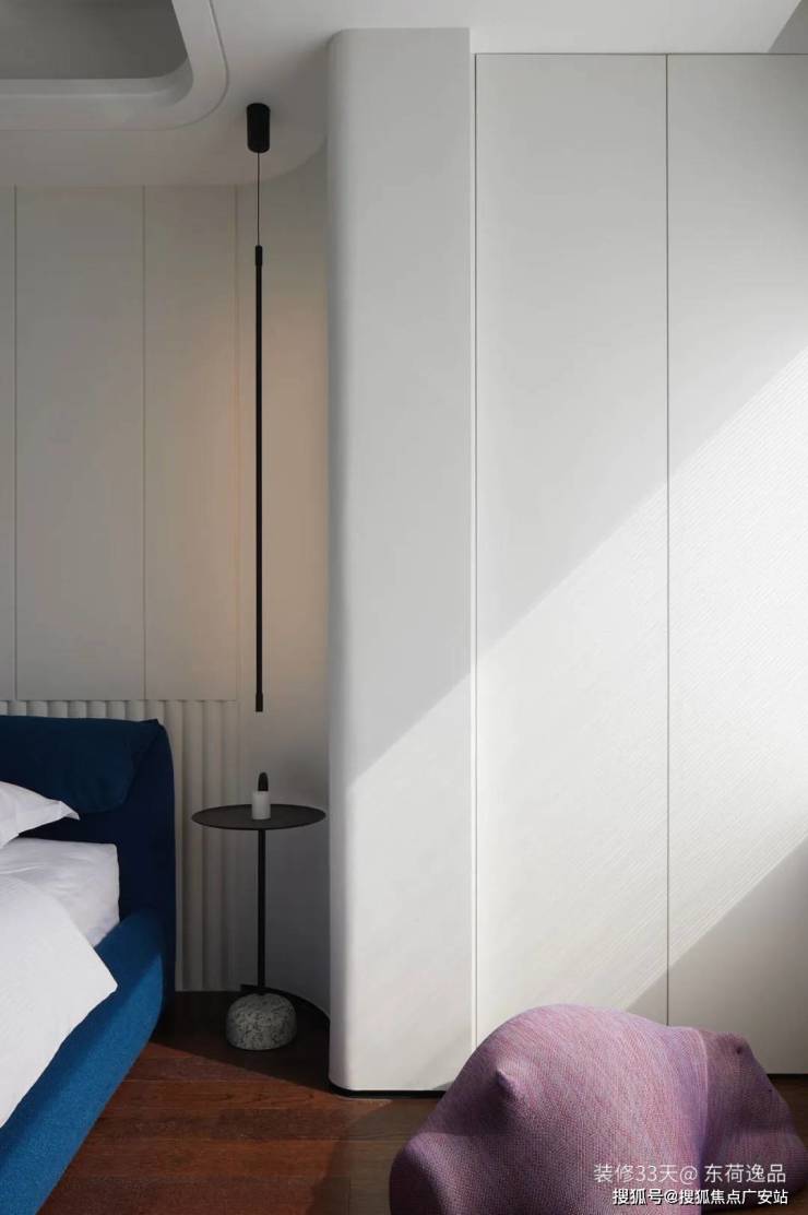 ▲ 次卧以大面积白色为基调,显得明亮宽敞,阳台两侧结构柱做弧形处理过渡,更加柔和自然