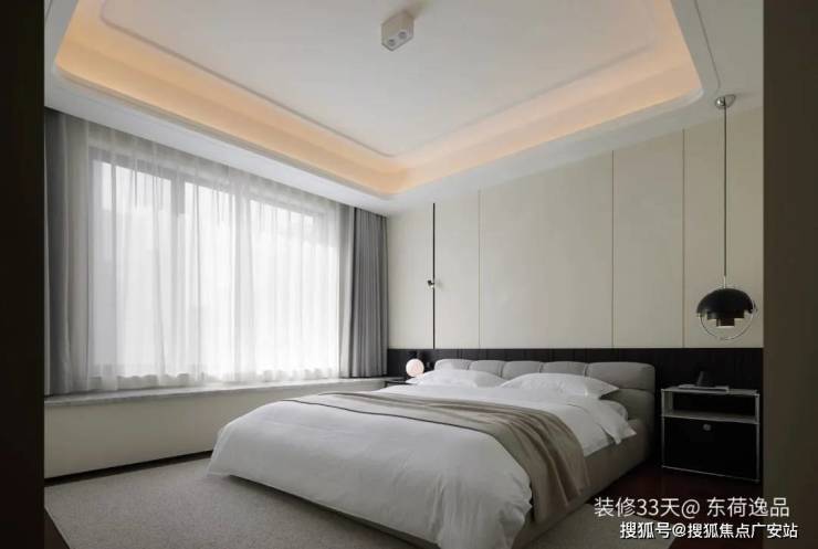 ▲ 主卧延续公区格调,上浅下深的床头背景富有质感与层次,吊顶四周嵌入灯带增添氛围
