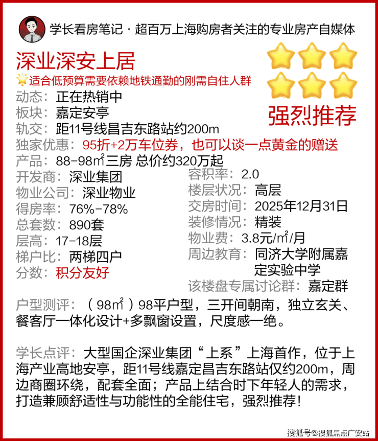 2024年第二批次入市的嘉定新房中,金地项目单价为4.6万/平,象屿项目单价为5.04万/平。均价3字打头的,只有深业·深安上居。