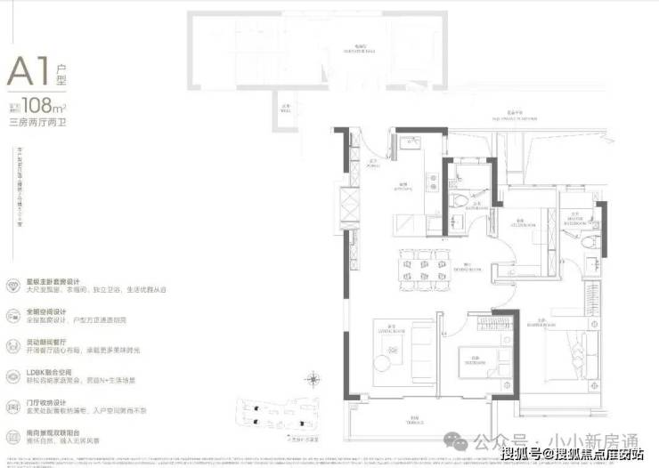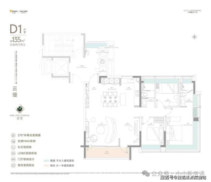 首先是进门即映入眼帘的LDBK一体化设计,搭配X灵动空间以及巨型宽面阳台,奢阔尺度非常出众;主卧约270°的转角飘窗,视野和采光全部拉满。
