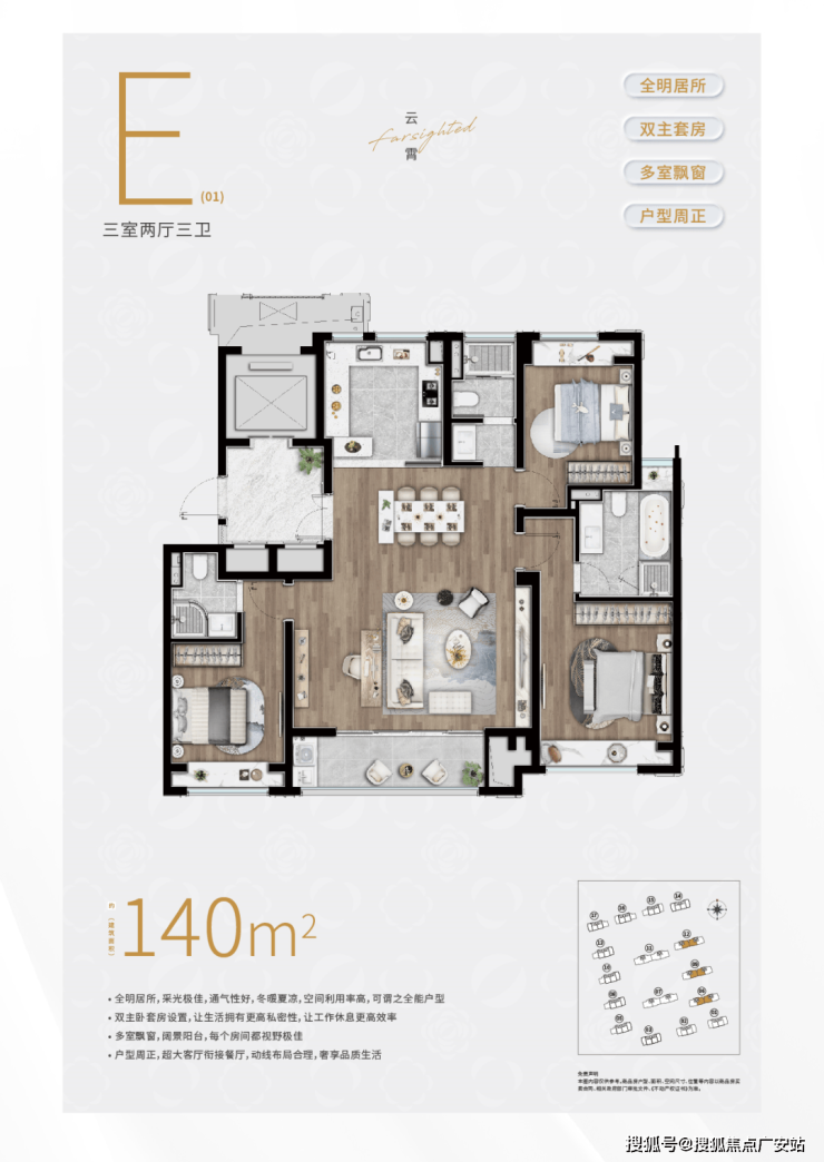 建面约140㎡3房3卫户型,三开间朝南+大横厅的设计,整个南向采光面相当宽绰。