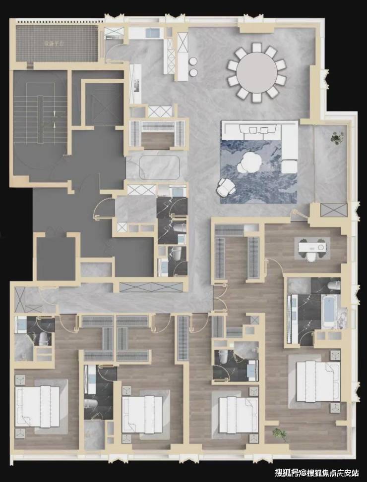 尤其主卧星级套房,配置独立衣帽间、书房,奢华主卫四分离,双台盆+淋浴区+大浴缸+智能马桶,私密性&奢适度无敌;