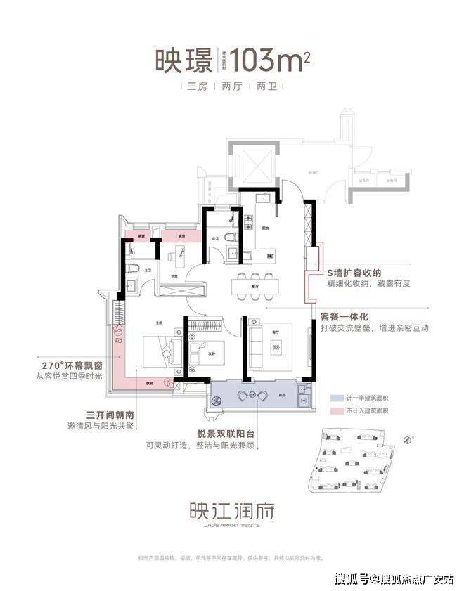 亮点五:双联阳台+多飘窗赠送、灵动空间。映江润府103户型,实现了100平级别难得的双联阳台,实现了室内空间的横向延伸,同时,搭配主卧、主卫、书房的“全飘窗”设计,赋予了空间更多灵动的使用场景。