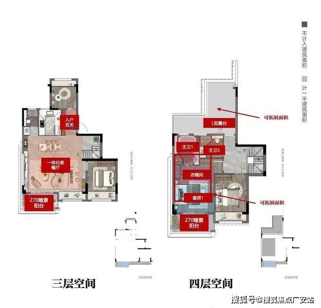 下叠附赠40-300㎡庭院,中叠享约20㎡L型露台,上叠可拓展40-60㎡屋顶花园
