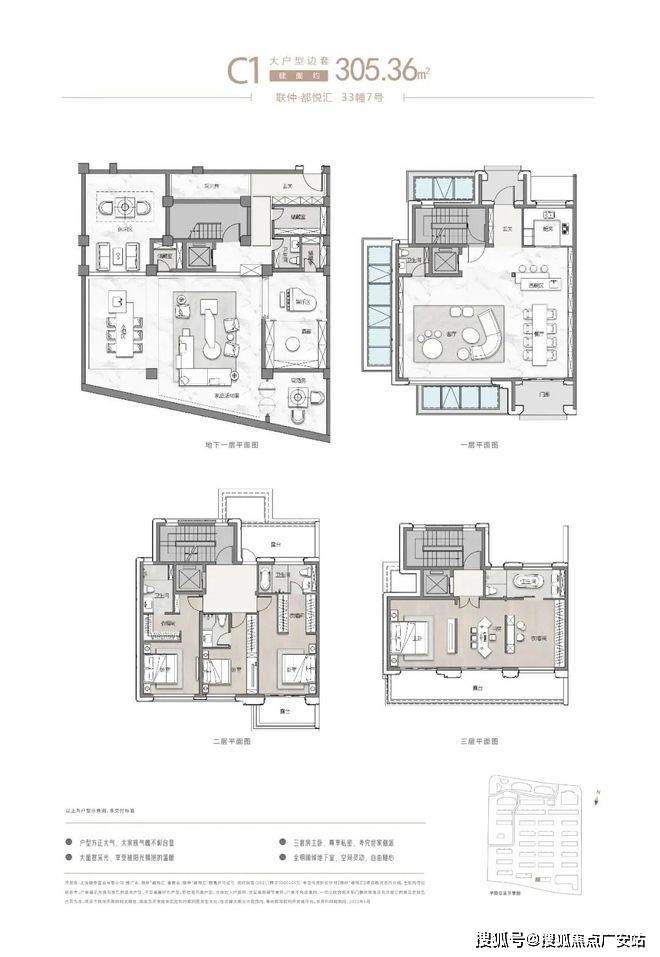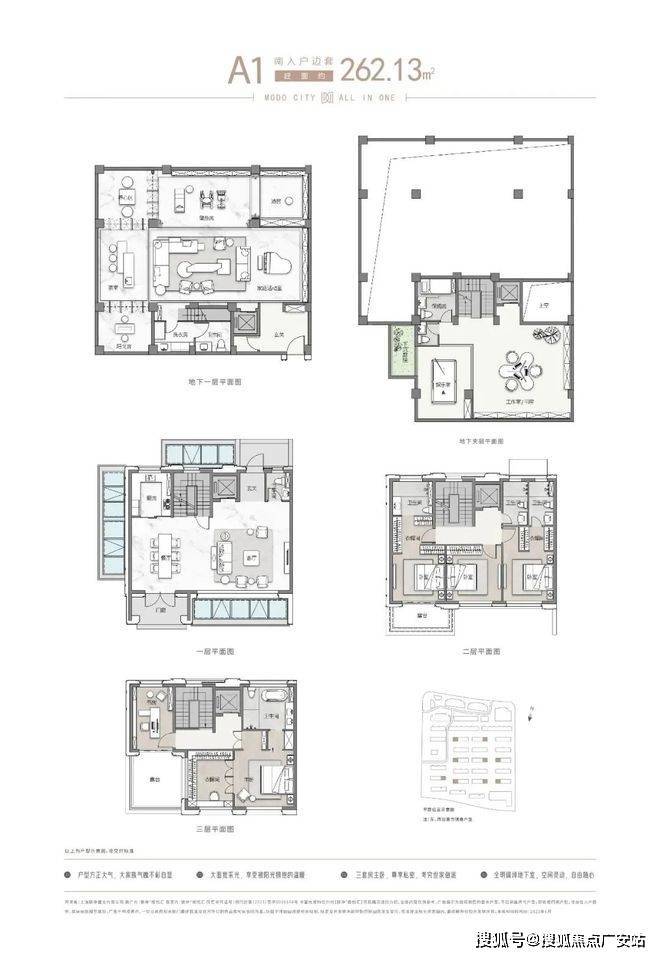 户型:建面约262-305㎡,地上三层+地下两层,层高3.6米起,地下室层高5.4米。