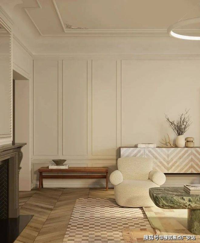 空间中每个物件都经过精心挑选:鱼骨拼木地板沉淀时光质感,格纹地毯与抹茶色大理石茶几搭配,营造出优雅而不失温度的氛围。