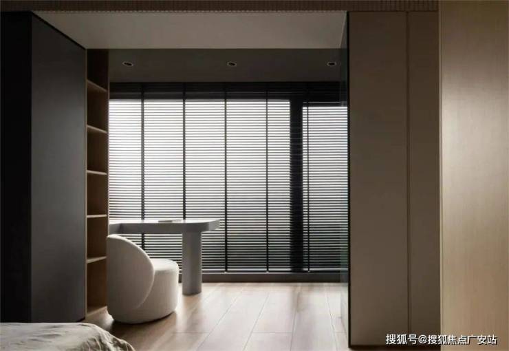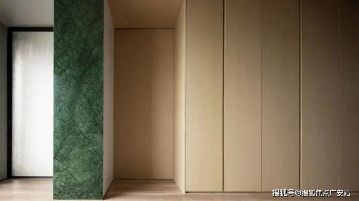 次卧室内,一处绿色的大理石尽显此处的轻奢底蕴,时光也因此而悠扬了起来,原木色的基础配置足以彰显空间的温暖气质,窗外的绿叶摇曳着,窗内的办公区随之轻盈了起来,一张桌,一处书架,便足够日常所需了。