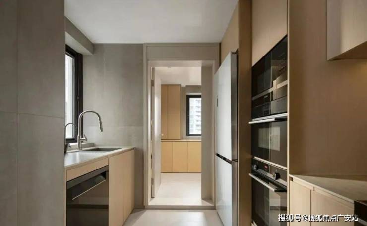 厨房内的功能性十分齐全,设计师选用了大地色和木质材料交相搭配,一同塑造了空间的优雅和清爽质感,让烹饪也变成了一件趣事儿。