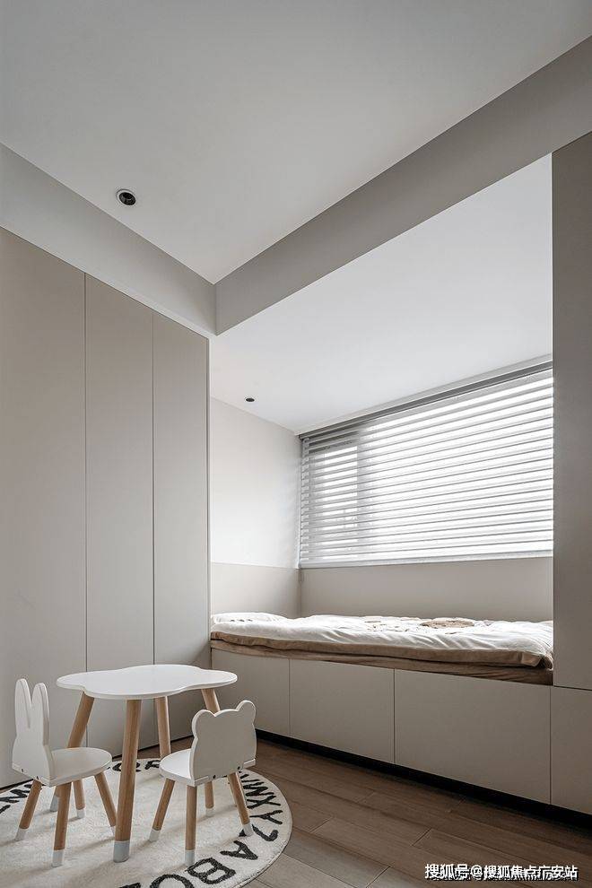 Althoughthespaceofthesecondbedroomisnotlarge,thebuilt-inoverallwardrobedesignhighlightsanobleandeleganttemperament,delicateandpractical,whilethecartoontableandchairbringendlessfunandsurprisetothechildren,sothattheirchildhoodisfullofwarmthandhappiness.