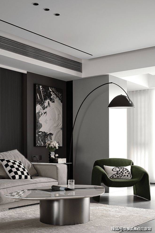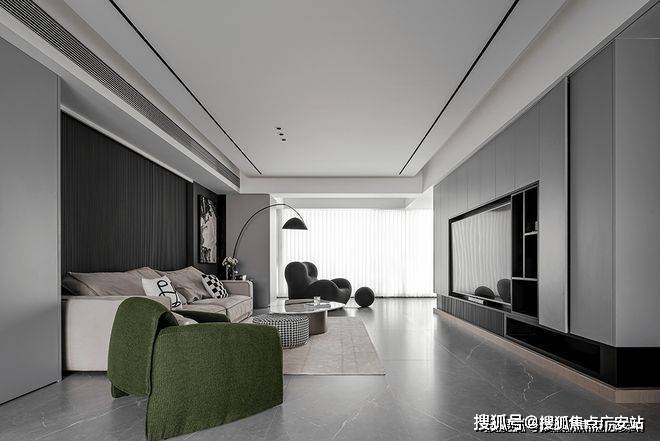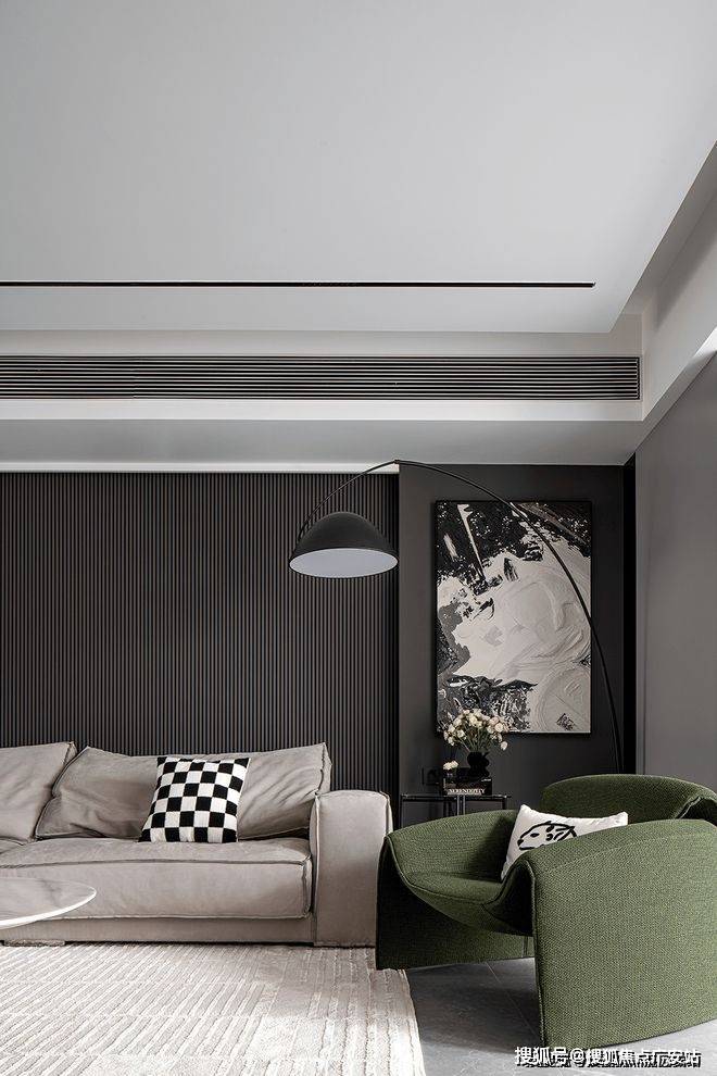Thedouble-layerceilingdesigncleverlygivesthespacearichersenseofhierarchy.Thebackgroundwallofthelivingroomsofaismadeofgrayhardcovermaterialandembellishedwithmetallines,whichrevealsatmosphereandeleganceinsimplicity.