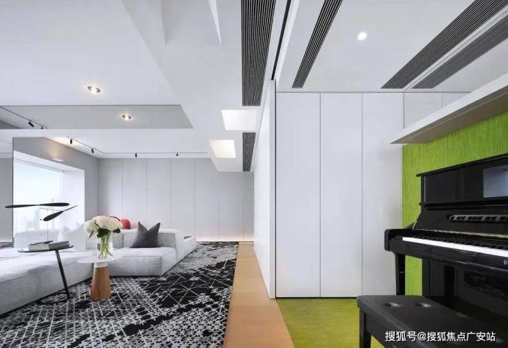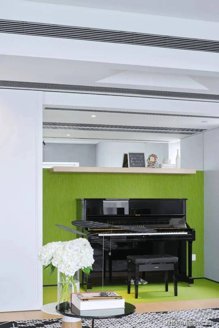 动线中,移动门的后方是钢琴房。开合间,让音乐成为空间的总指挥,与艺术的装饰共生融合。
