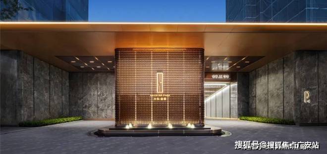地上大堂,单元门厅的雨棚采用香槟金的弧面铝板、立面干挂爱马仕灰蜂窝岩板,岩板上嵌入专属楼栋号,单元门两侧的弧线段金属采用定制模具加工。