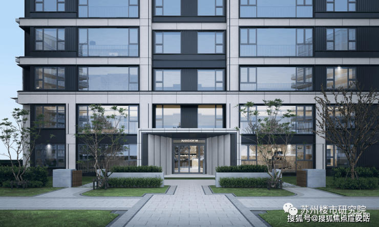现代简约风格,六重精工体系,局部米白色石材、局部深灰色铝板、深灰色金属漆、米白色真石漆、三玻两腔中空low-e玻璃,配以超高窗墙比,大气美观。