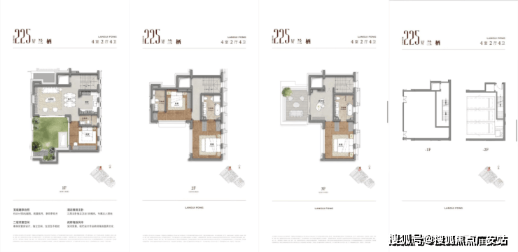 外围沿街临河同样为 建面约225㎡四房联排风貌别墅, 主要区别在于客餐厅和花园面积做了缩减,但优势在于卧室空间的处理: