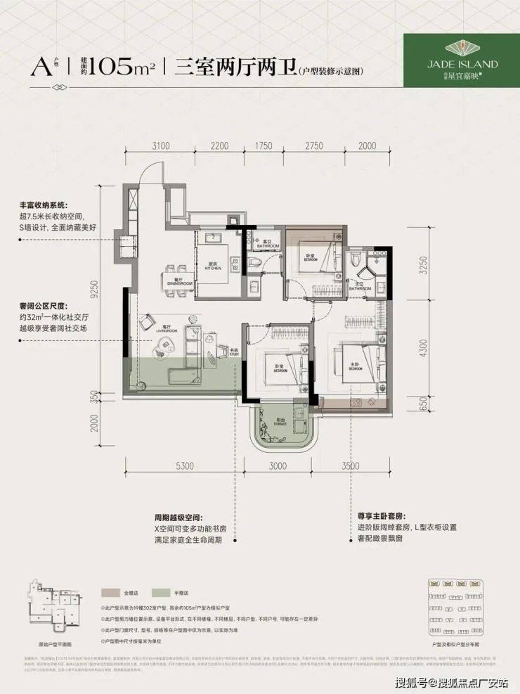 建面约105㎡南厅户型,3房2厅2卫,含赠送得房率约93%。