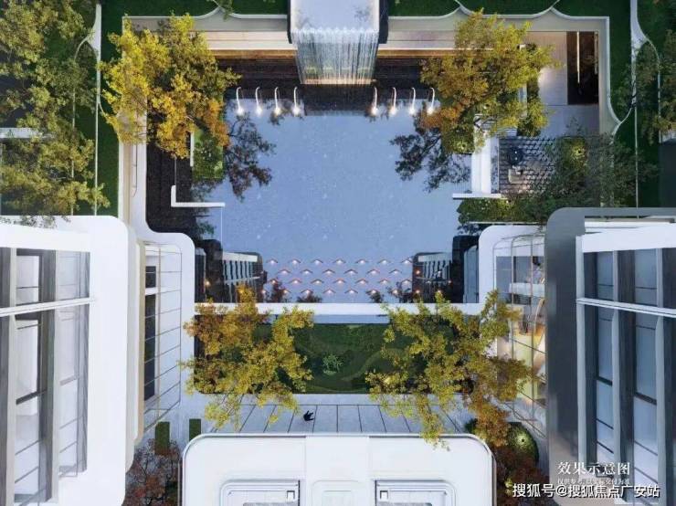 1200平米下沉式庭院,叠水成瀑,打破常规“坑洞”设计,打造上下双层平行空间,营造独特的滨水度假体验,令人一见倾心。