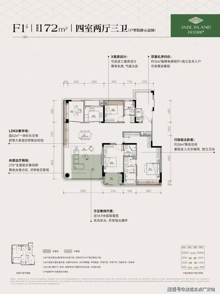 建面约172㎡F1户型,4房2厅3卫,含赠送得房率约96%。