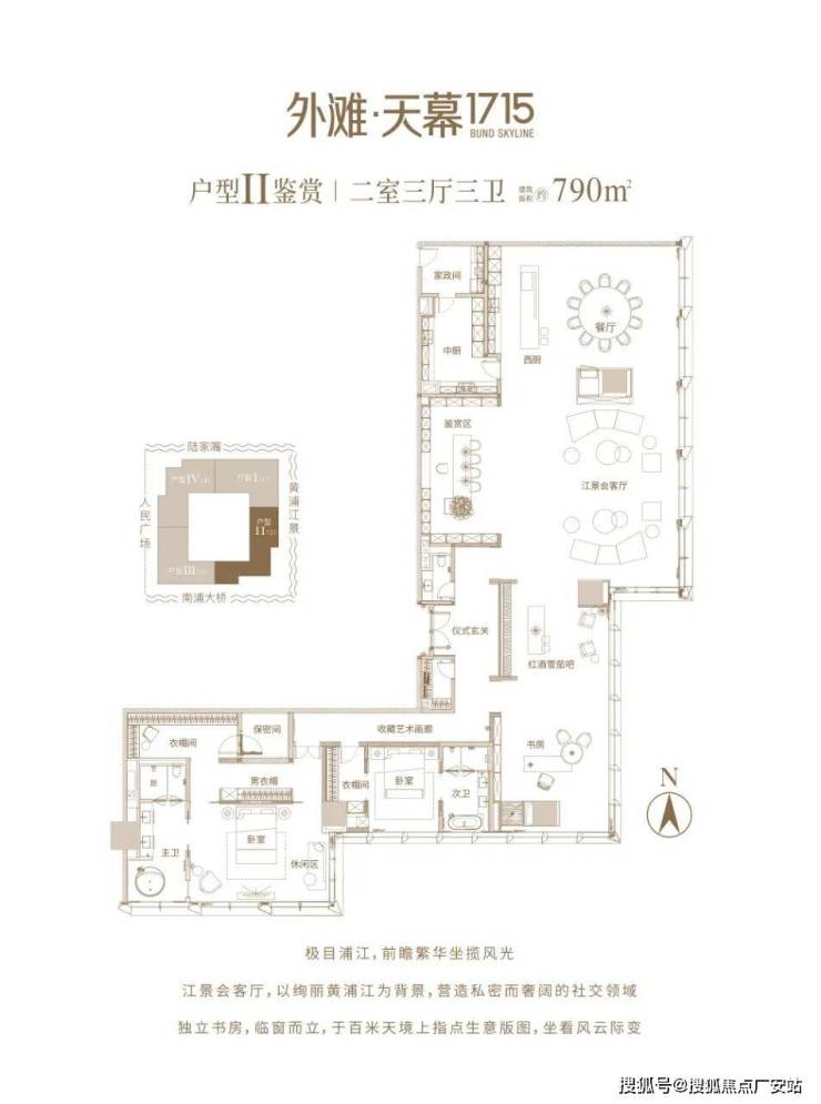 外滩·天幕1715,位于外滩地标绿地外滩中心T1#300m超高层楼栋,标准层高约4.5m,主力户型面积约724-799㎡,以一种塔尖群体向往的融合式生活方式,诠释外滩滨江恒产的价值高度。于此,以王者视角,俯揽黄浦江,对望陆家嘴,尽享上海城市之曜。