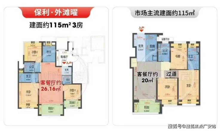 建面约115㎡3房,实得率约93%!常规的同面积产品,也不过约80%上下。