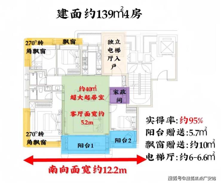 项目全系户型标配“全屋飘窗(全赠送)+双阳台(半赠送)+独立电梯厅”。