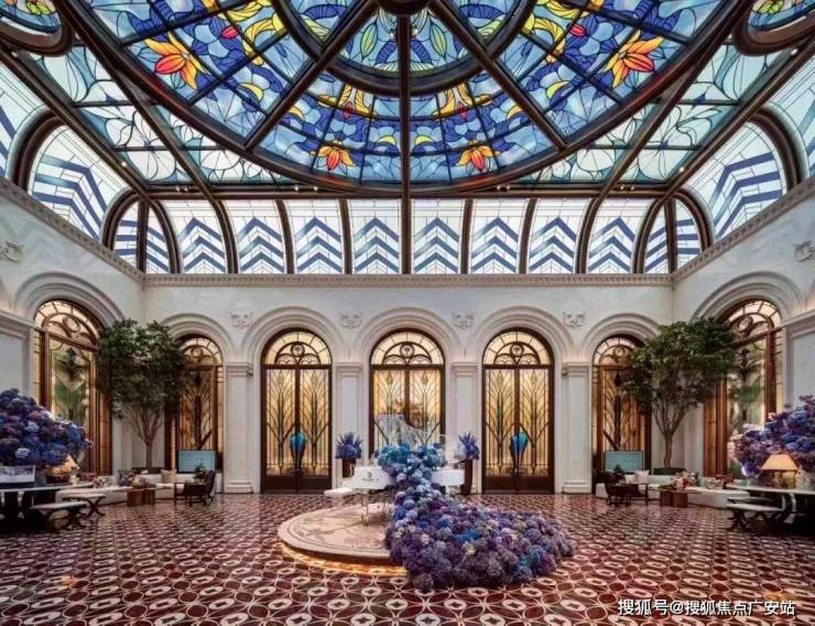 彩绘玻璃穹顶巧妙地散射着柔和天光,流光溢彩的艺术美韵在空间中浮动。艺术拱门与浮雕墙面交错排列,深刻诠释了海派建筑兼容并蓄的精髓。琴声悠扬,繁花烂漫,蓝紫色渐变色调描绘着季节的流转,共同构筑了一个融合自然、美学与温情的社交场域。