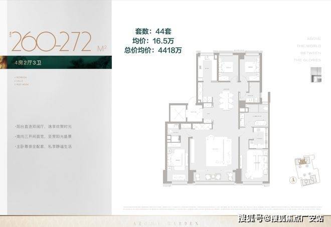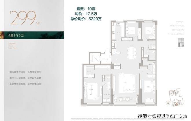 400㎡,4房4卫,单价16.5万,同理的西边套,户型几乎完全相同,不赘述了,单价提升的逻辑就是所在的楼栋南侧更开阔一些。