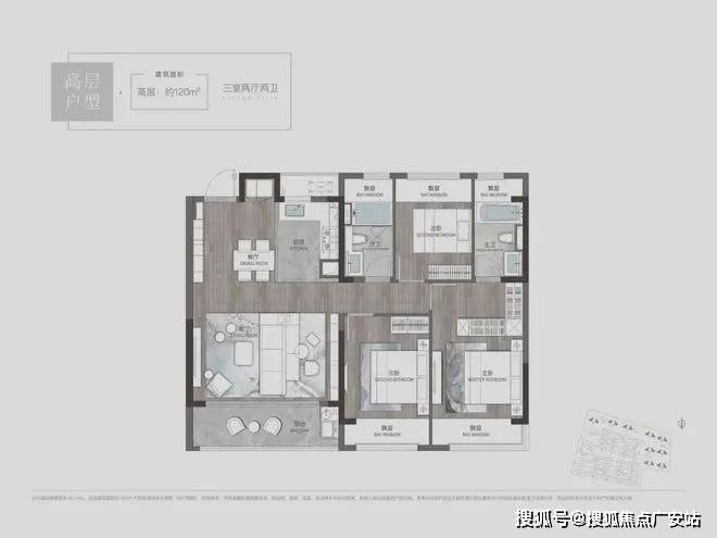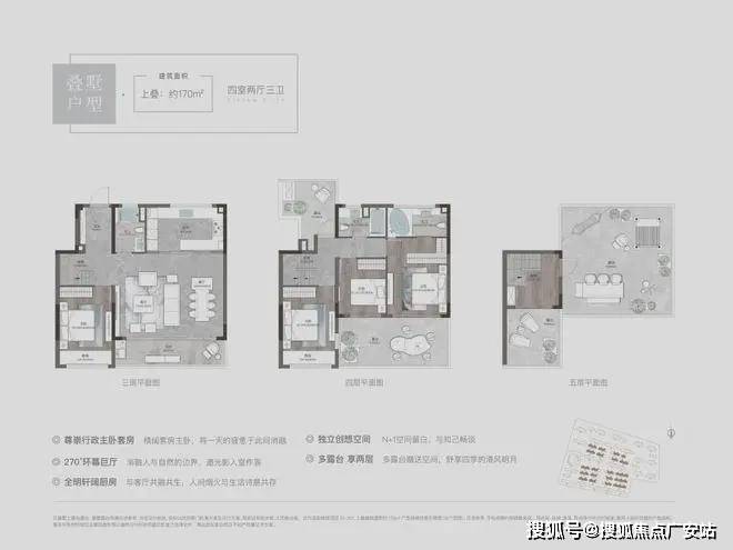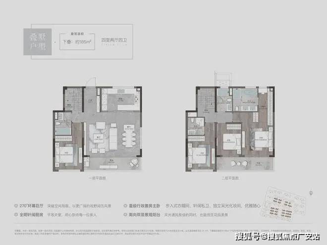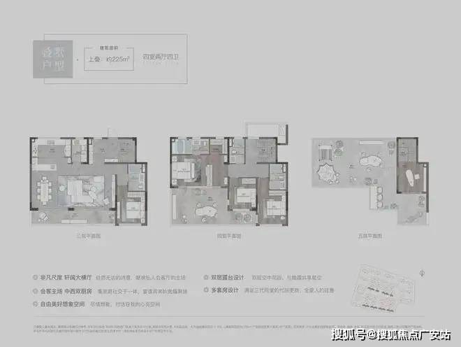 溪前雅居最小的叠墅户型,户型设计为4房2厅3卫,3层、4层均是三开间朝南,南向开间巨大,尺度阔绰。