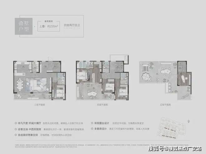3层有着大横厅、大阳台设计;4层设计有3间卧室,主卧为套房设计,外接一个超大露台;5层还有一个神来之笔——设计了一整层的露台空间!